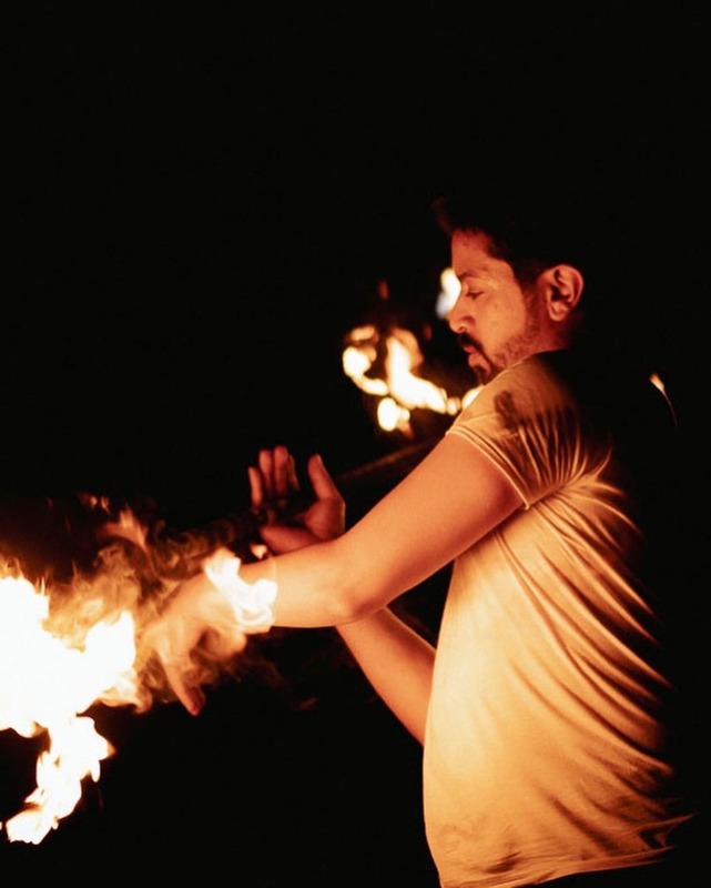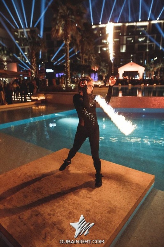 x3 sets of 10 mins each (over 1.5 hours), black fire-safe uniform with Coven Dubai logo, freestyle fire show, props, fire safety equipment, fuel, transportation within Dubai