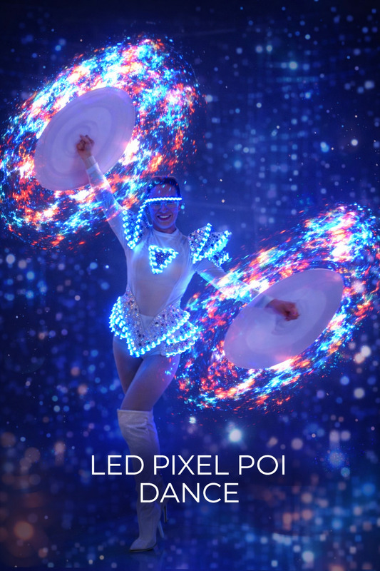 Adagio -Hand balance -Water bubble -Martini glass -Mirror Ball -Trolley act -Acro duo -Fire show -Led show -Stilts walker - Led pixel poi - Ribbon gymnastics- Cage - Sway pole