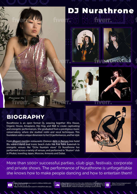 Nurathrone is an open format Dj, weaving together Afro House, Organic House, Amapiano, Hip Hop, and R&B to create captivating and energetic performances. She graduated from a prestigious music conservatory, where she studied violin and vocal techniques. This foundation adds a unique dimension to her DJ performances, and her style