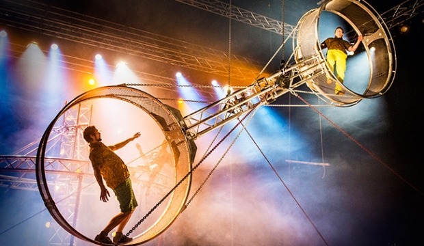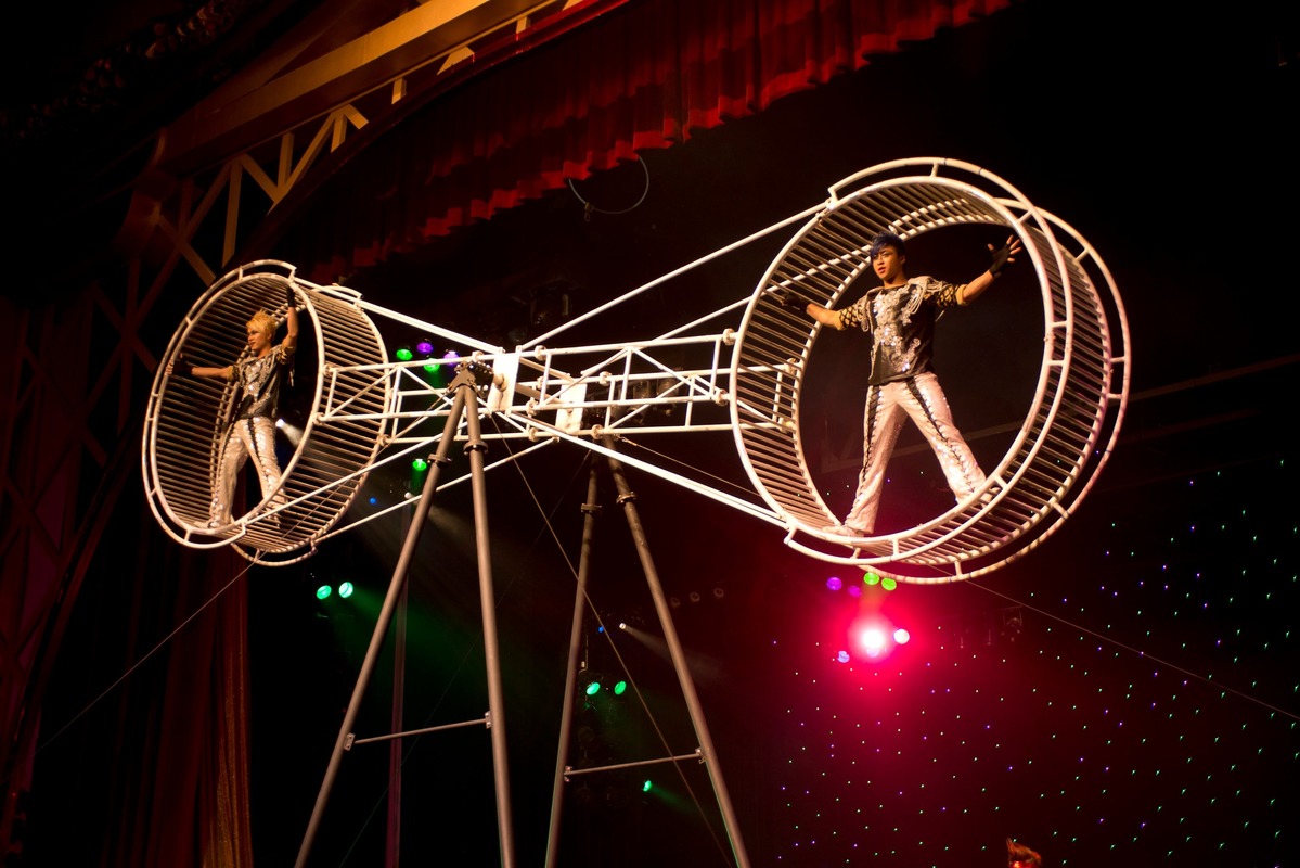 The Wheel of Death, is a large rotating apparatus on which performers carry out synchronises acrobatic skills. The "wheel" is actually a large space frame beam with hooped tracks at either end, within which the performers can stand. As the performers run around on either the inside or outside of the hoops, the whole apparatus rotates. Performers also perform balancing skills with the wheel in a stationary position.