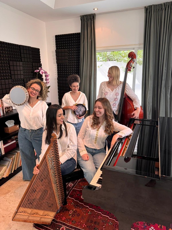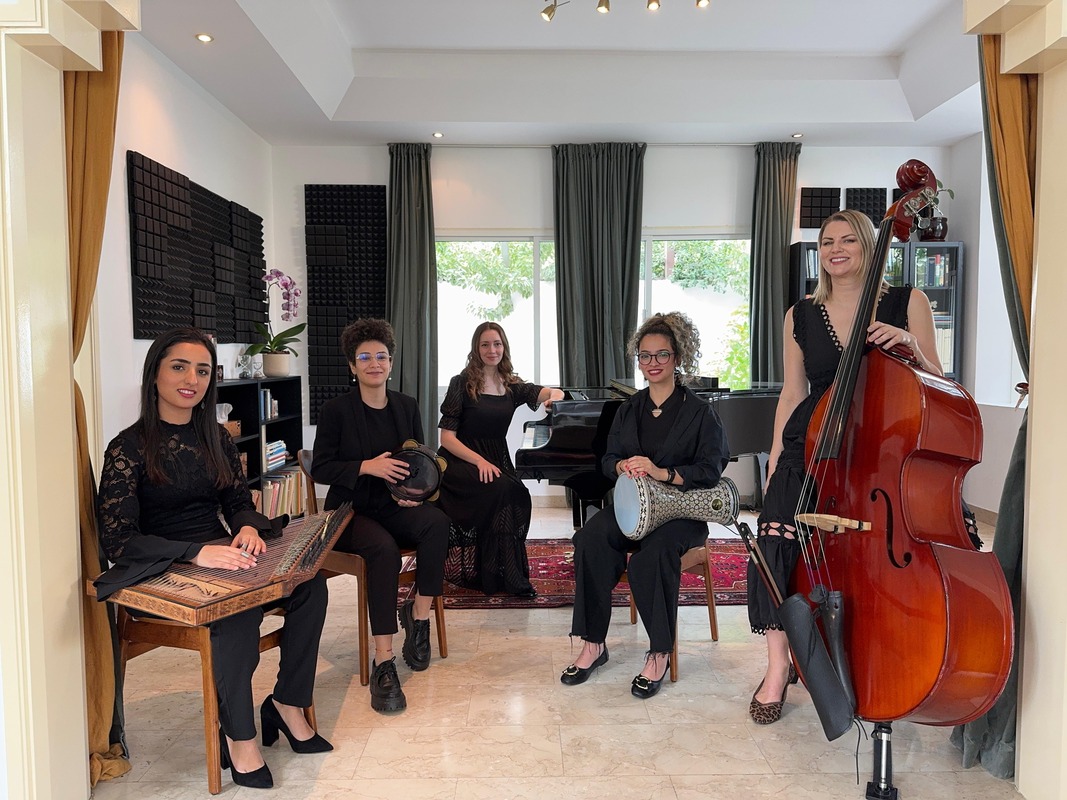 5 musicians Flying with the qanoon and percussion instruments